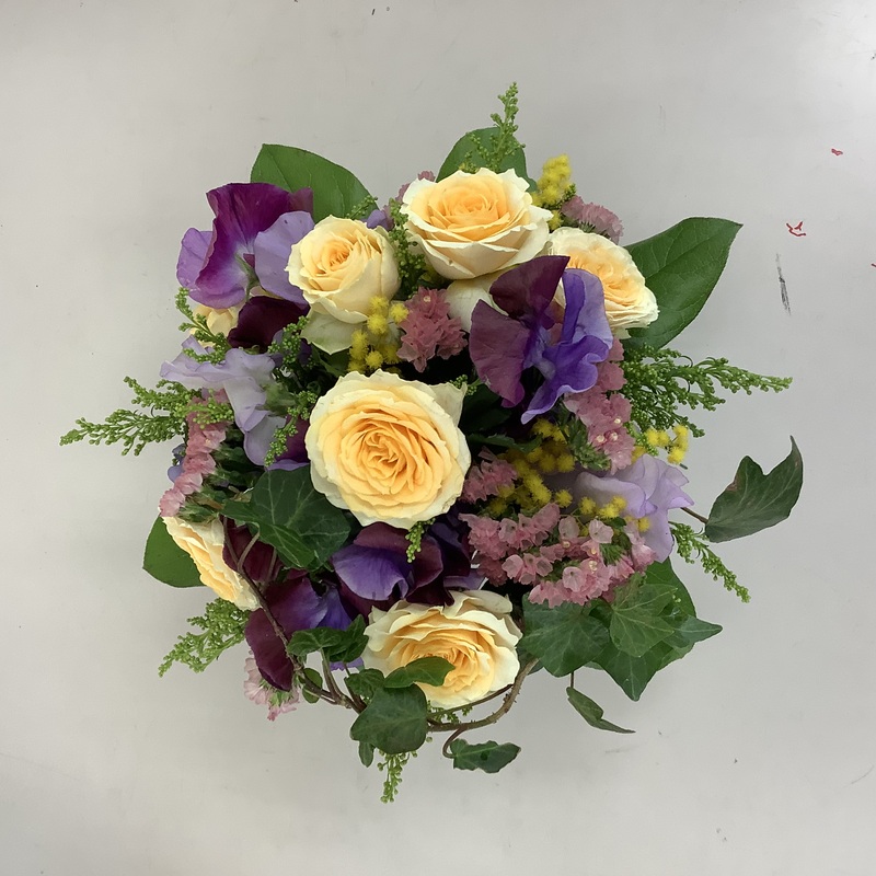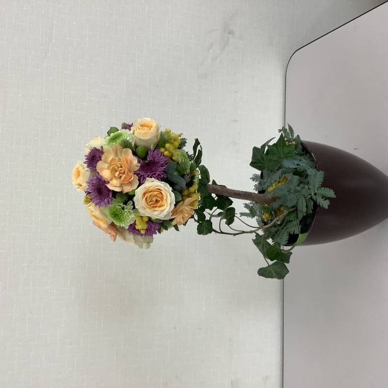 ミモザ、バラ、スターチス、ソリダコ、